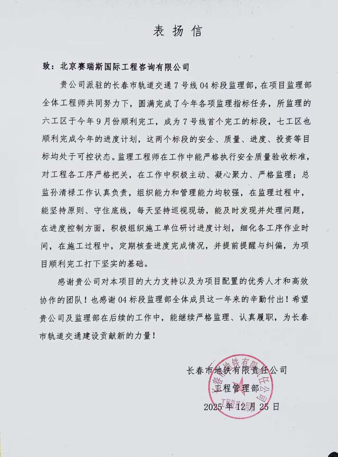 表?yè)P(yáng)信不僅是一份榮譽(yù),更是一份沉甸甸的責(zé)任。在未來(lái)的工作中,賽瑞斯人將繼續(xù)銘用扎實(shí)的行動(dòng)詮釋責(zé)任擔(dān)當(dāng),不辜負(fù)這份信任與肯定,以更飽滿(mǎn)的熱情、更專(zhuān)業(yè)的技術(shù)水平服務(wù)客戶(hù),為長(zhǎng)春軌道交通發(fā)展貢獻(xiàn)力量。